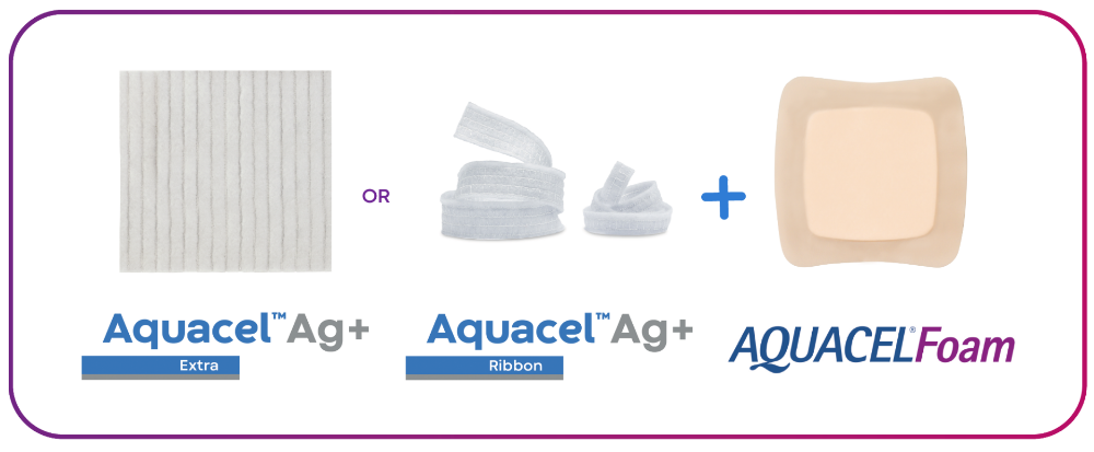 AQUACEL® Ag+ dressings are antimicrobial primary dressings intended to be used under the direction of a healthcare professional for wounds, which are at risk of infection or show signs of infection, or where biofilm is suspected to be present, and in accordance with the indications for use.