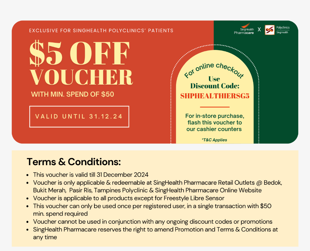 Take a screenshot of this page and flash the voucher at SingHealth Pharmacare Retail Outlets @ Bedok, Bukit Merah, Pasir Ris or Tampines Polyclinic during payment at the cashier counters.