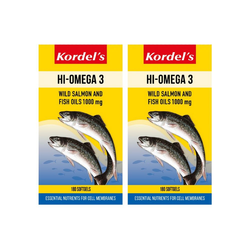Kordel’s Hi-Omega 3 Wild Salmon & Fish Oils 1000 mg is an excellent source of important omega-3 fatty acids, EPA & DHA. This unique fish oil blend delivers high 180 mg EPA and 120 mg DHA in each capsule, and is a mixture of wild salmon, anchovies, sardines and other fishes. Cold water fish are a naturally rich source of EPA and DHA. They are nutrient essential for good cell membrane function and are important building blocks for nerve and brain tissues. They help to maintain healthy lipid levels in the body and support smooth blood flow. Each and every batch of Kordel’s Hi-Omega 3 Wild Salmon Fish Oil 1000 mg undergoes additional testing for freshness, quality and heavy metals such as mercury and lead. Product Directions: Adults take three capsules a day, after meals, or as directed by a healthcare professional. Product Ingredients: Wild Salmon & Fish Oils — 1000 mg Providing: • Eicosapentaenoic Acid (EPA) — 180 mg • Docosahexaenoic Acid (DHA) — 120 mg