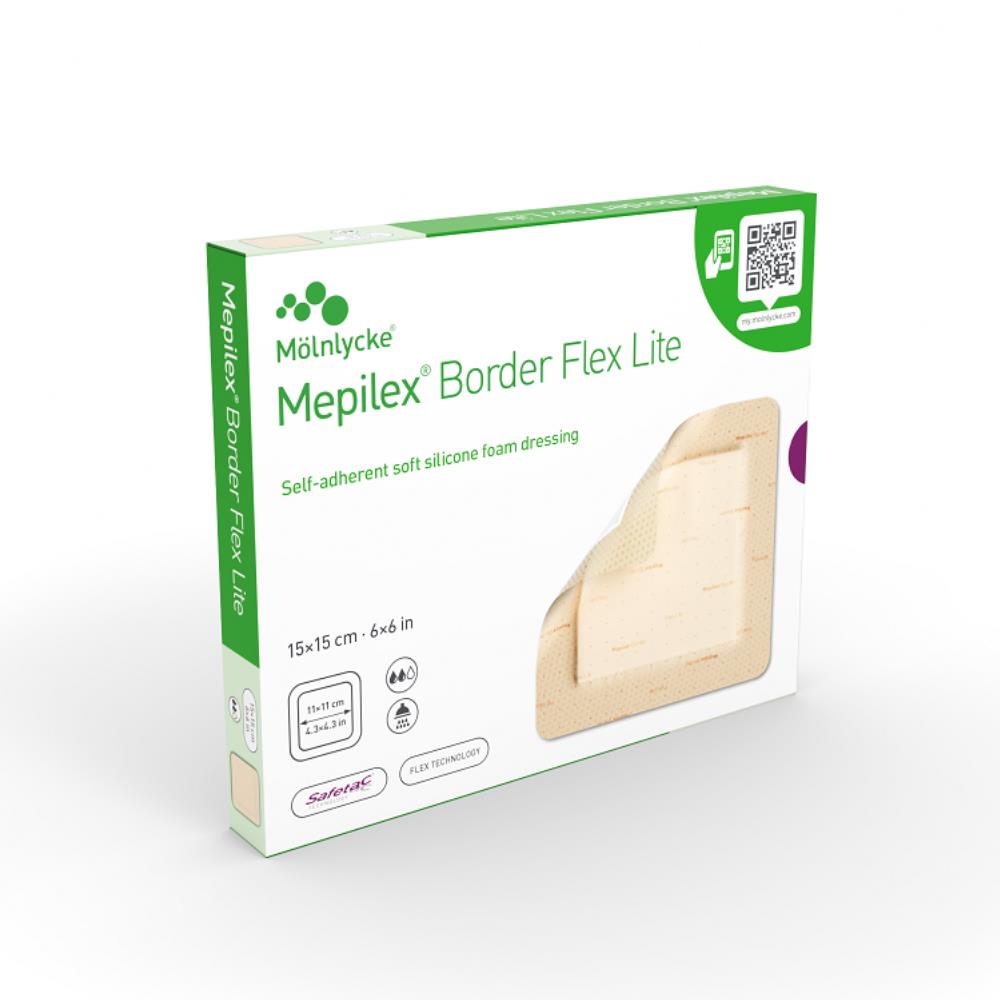 Mepilex Border Flex Lite is a thin, highly conformable, self-adherent and absorbent dressing that maintains a moist wound environment. The waterproof outer layer protects the wound from dirt and bacteria. The dressing has a Safetac® wound contact layer that is a unique adhesive technology. It minimises pain to patients and trauma to wounds and the surrounding skin at dressing removal. Product Directions: Instructions How product works: Mepilex Border Flex Lite can be used by lay persons under supervision of health care professionals. 1. Cleanse the wound in accordance with clinical practice. 2. Dry the surrounding skin thoroughly. 3. Select an appropriate dressing size. The wound pad should cover the dry surrounding skin by at least 1–2 cm in order to protect the surrounding skin from maceration and to affix the dressing securely. 4. Remove the first release film and apply the adherent side to the wound. 5. Remove the remaining release film(s) and smooth down the dressing on the skin. Do not stretch. The dressing change interval may be several days. Change the dressing before it is fully saturated, at signs of leakage, or as indicated by clinical practice. • Mepilex Border Flex Lite can be used under compression bandaging. • Mepilex Border Flex Lite can be used in combination with gels. Disposal should be handled according to local environmental procedures. Precautions Do not use Mepilex Border Flex Lite on patient and/or user with known hypersensitivity to the ingoing materials/components of the product. • Do not use together with oxidising agents such as hypochlorite solutions or hydrogen peroxide. • If you see signs of clinical infection e.g. fever or if the wound or surrounding skin becomes red, warm or swollen, consult a health care professional for appropriate treatment. Warnings The polyurethane foam used in the product may change colour to more yellow when it is exposed to light, air and/or heat. The colour change has no influence on product properties when used before expiry date. If any serious incident has occurred in relation to the use of Mepilex Border Flex Lite it should be reported to Mölnlycke Health Care and to your local competent authority.