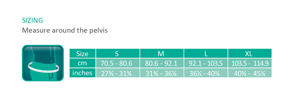 First, lay flat on the floor. Unfasten the Velcro® between the two pads. Wrap truss around pelvis as shown with removable pad in front. Fasten the front Velcro® to fit snugly (Once adjusted to fit the user on first application, the Velcro® strap between the pad pockets does not need to be re-adjusted for each application.) Pull the 2 straps between the legs to the back. Thread through the buckles and adjust for a comfortable fit.