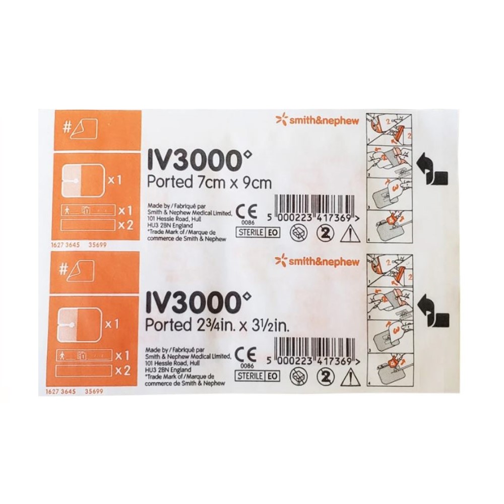 IV3000 featuring a high moisture vapour transmission rate (MVTR) to help prevent bacterial contamination associated with moisture accumulation around intravenous (IV) catheter sites.Easy to remove while minimising patient discomfort, with a transparent construction to allow continual monitoring of the IV site. Protection against the threat of infection. Moisture creates an ideal environment for bacteria to flourish, with potential for microorganisms to cause serious infection. IV3000 Dressings help to minimise moisture build-up, which is an important feature for catheter-related bloodstream infection (CRBSI) prevention strategies. Product Directions: Instructions for use: 1) Clean and thoroughly dry the application area in accordance with clinical procedure. 2) First remove the securing strips (section 1) from the rounded end of the dressing and apply as required, ensuring that the strips do not cover the insertion site. 3) This contains two sterile strips and a date label. The strips can be used on the catheter wings or hub for improved security, to secure tubing or to stabilise catheter lumens. 4) Remove the proctector paper (section 2) in the direction indicated in the diagram. 5) Position the dressing with the catheter sitting snugly in the dressing port. 6) Adhere the adhesive film part of the dressing over the catheter whilst ensuring minimal creasing. 7) Remove the printed transparent carrier (section 3) by lifting the non-adhesive tab at the end of the dressing and pulling until the carrier is removed. 8) Remove the remaining protector papers (section 4) and adhere the fabric sections of the dressing over the wings of the catheter. 9) Mould the film around the catheter to complete dressing application, ensuring the dressing is secure and the patient is comfortable. 10) In accordance with local clinical protocols, information may be recorded with a ballpoint pen on the documentation label before removing from the carrier (1) and being placed in the patient''s notes, on the skin or on the dressing (without obscuring the view of the catheter insertion site).
