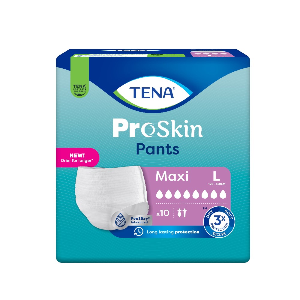 TENA PROskin Pants Maxi are white, soft and comfortable, disposable incontinence pants for men and women with pull up fit just like regular underwear. With a close body-fit and textile like, breathable materials they are designed for soft comfort. Unlike standard adult diapers, TENA PROskin Pants Maxi have a core with maximum absorbency that quickly and effectively locks in liquid for total security. When worn, the thin and flexible core shape forms two absorption channels, also known as the Dual Absorption Zone, that efficiently channel moisture away from the body for optimum dryness and protection. Integrated leakage barriers provide additional security. Reliable protection against leakage for an active lifestyle and confidence, no matter the situation. Size guideline : 120 – 160cm /(48 – 64 inches)