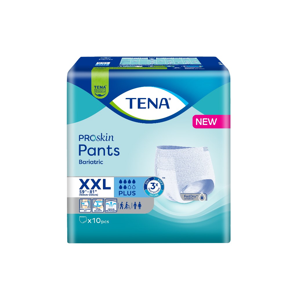 TENA PROskin Pants Bariatric Plus XXL are soft and comfortable incontinence pants specially designed for overweight or obese people with a larger waist size. They are easy to pull on and off with stretch materials and feel like normal underwear - encouraging greater independence. With a close-body fit, the incontinence pants suit both women and men and are for both day and night usage. Unlike standard adult diapers, TENA PROskin Pants Bariatric Plus has moisture-reducing technologies to ensure dryness, leakage security, and odor control. The liquid is quickly drawn away from the surface and the fast-absorbing core then rapidly locks in urine, even in larger quantities, keeping the skin dry. With longer core now for better absorption coverage which enhances leakage protection Size guideline : 150 – 205cm /(59 - 81 inches)